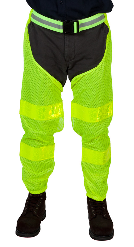 Safety chaps made of 3.4 oz. per sq. yd. Yellow-green soft fluorescent polyester mesh with two 3” lime-yellow reflective strips, one above the knee and one below. 2” yellow-green elastic waist fastened with a side release.