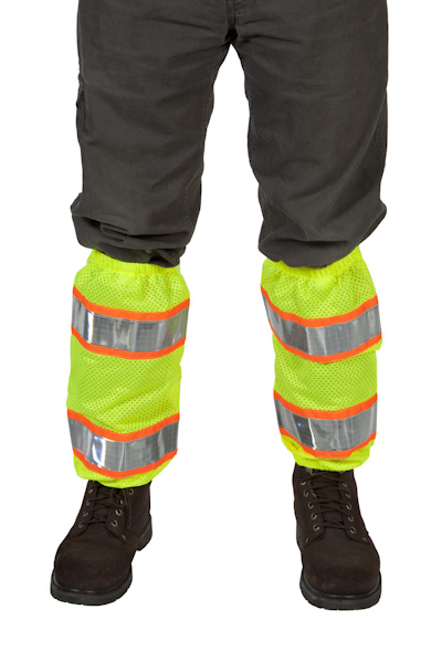 Safety leggings PDR made of 3.4 oz. per sq. yd. yellow-green soft fluorescent polyester mesh with two 2-inch silver Reflexite reflective trim edged on each side with ½” soft polyester mesh fabric in red orange. Fully adjustable for a perfect fit with elastic at top and bottom, three Velcro strips for closing makes the legging easy to put over clothing and boots. Material and reflective strips meet ANSI/ISEA 107-2010 specification for Class E high-visibility safety apparel. These safety leggings when worn with a Class 2 vest are classified as a Class 3 ensemble.