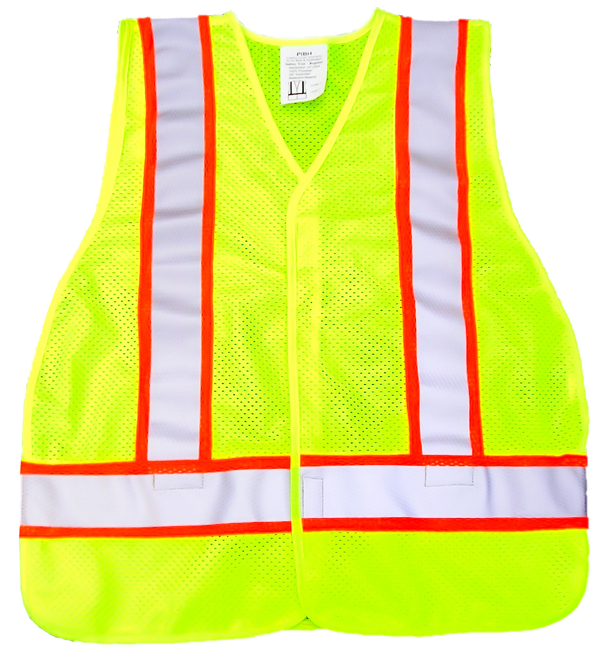 Safety vest TP of 3.4 oz. per sq. yd. yellow-green soft mesh fluorescent polyester material with 2” silver reflective trim and edged on each side with ½” soft polyester mesh fabric trim in red orange around the waist and over each shoulder. Open front, hook and loop closures and reflective hook and loop side adjustments. This vest has 360-degree reflective visibility. Meets and exceeds the American National Standard ANSI/ISEA 107-2010 specification for Class II high-visibility safety apparel.
