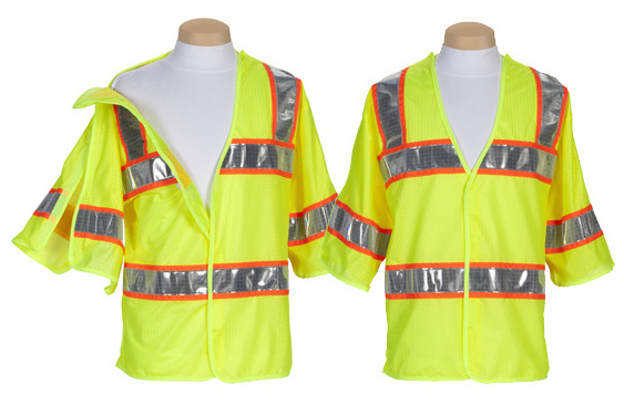 Safety Vest, Class III, PDR, made of 3.4 oz. per sq. yd. yellow-green soft mesh fluorescent polyester material with sleeves. Reflexite 2” GP440 silver reflective trim, edged on each side with 1/2” soft polyester ribbon fabric trim in fluorescent orange around the chest, waist and over each shoulder and around sleeves. Open front, hook and loop closures. This vest has 360-degree reflective visibility. Meets and exceeds the American National Standard ANSI/ISEA 107-2010 specification for Class III high-visibility safety apparel. Models with pockets have two 7” deep pockets full width on the inside of the front panels. Hook and loop closed to protect contents